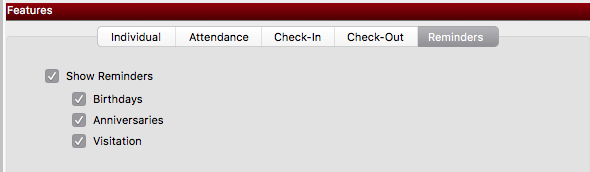 In the Features section of the window, there are tabs for each of the sub-apps or features in CDM+ Mobile. Note that the Individual and Attendance features are only available if you have the Membership/Attendance program in your CDM+ desktop software suite. Likewise, you must have the Check-In/Check-Out program in your CDM+ suite to use Mobile Check-In or Check-Out features. If you wish to add programs to your CDM+ suite, please contact the Sales Department at 877-891-4236.