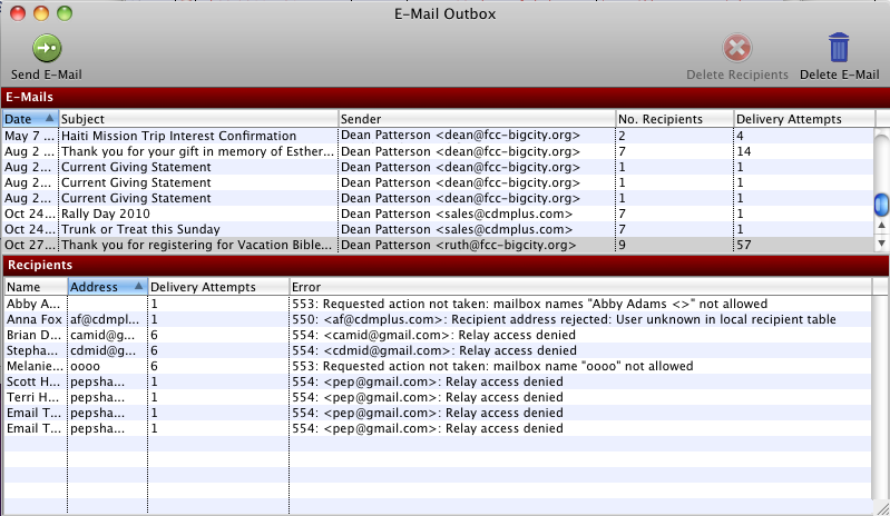 The E-mail Outbox window shows the status of email messages in your outbox. Normally, these are emails you have attempted to send that did not reach their intended recipients. Clicking on an email in the top half of the window brings up a list of its intended recipients in the bottom half of the window. You will be able to see the recipient's name, the email address you used in the attempt, how many times CDM+ tried to deliver the email and the error that prevented the email from sending successfully.