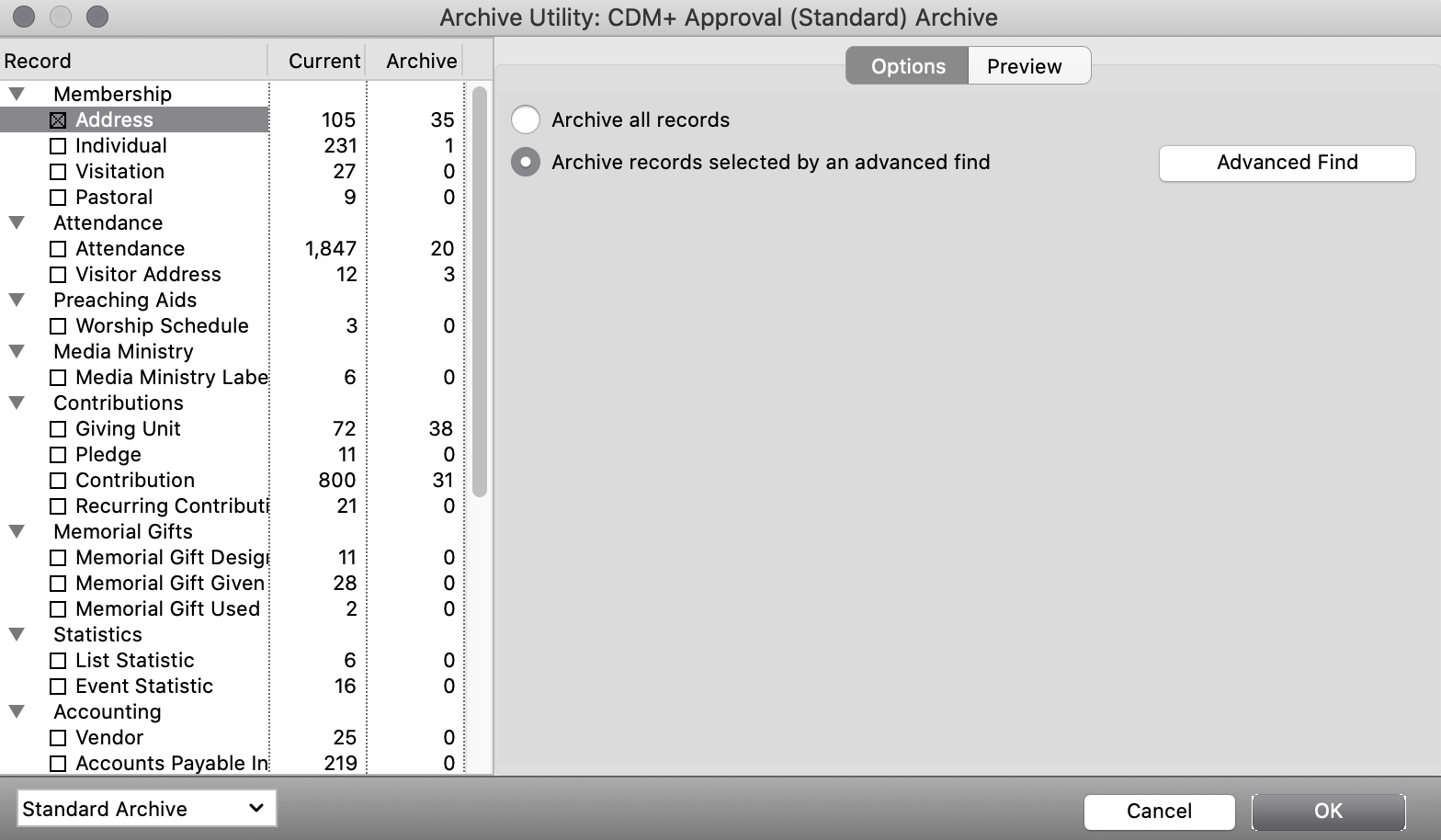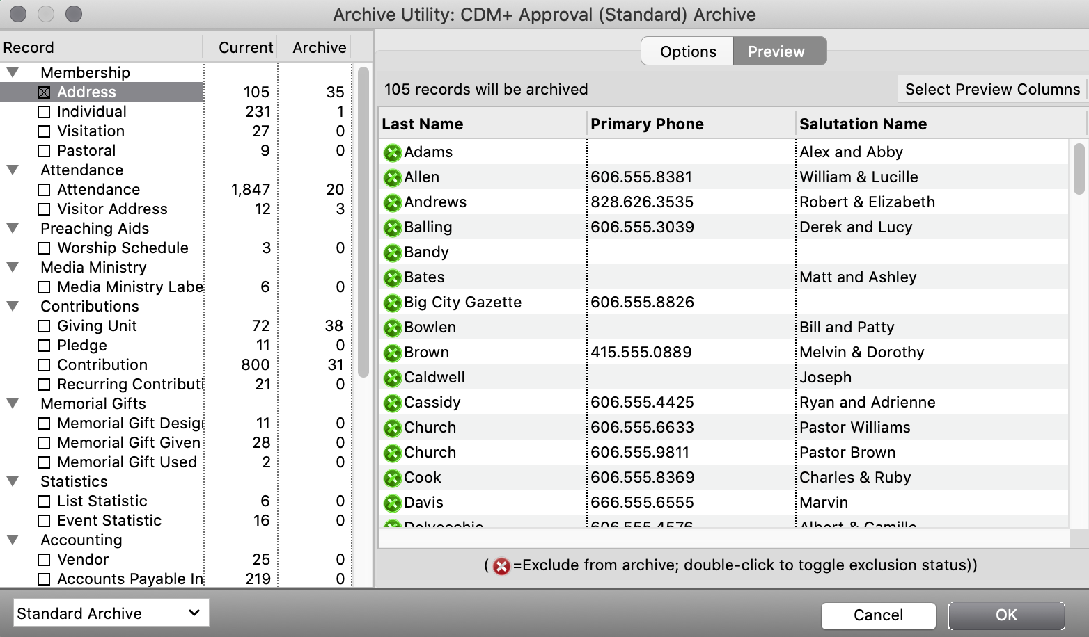 Click the Preview tab to see a preview of the records you selected on the Options tab. You may choose to exclude specific records from the archive restoration here if you desire. Double-click a line to change the icon from green to red and gray out the record you do not want to restore.