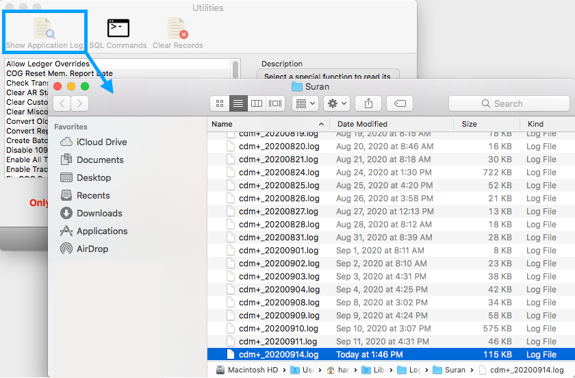 The Show Application Logs button allows you to view the CDM+ application log. This log displays messages output by CDM+ and is used primarily by tech support for troubleshooting purposes.