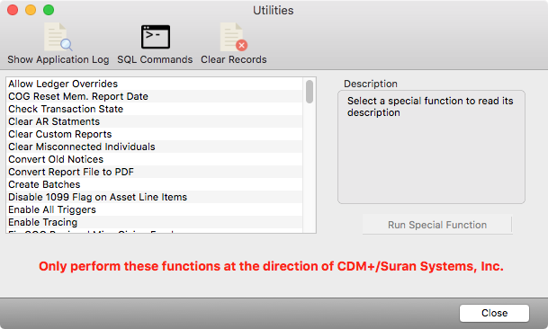 This tab offers a number of troubleshooting routines that CDM+ Technical Support might direct you to use. DO NOT run any special function unless directed to do so by tech support. Incorrect use of these routines can result in a PERMANENT LOSS OF DATA.These options are only available after logging into CDM+.