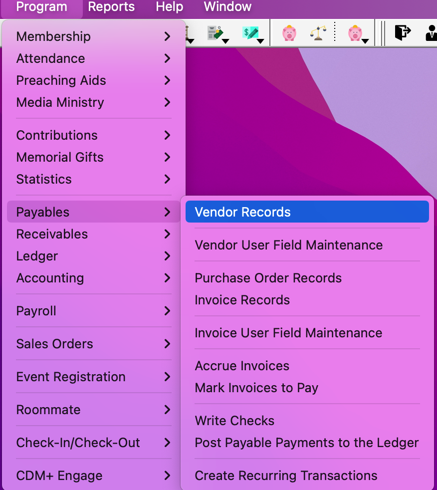 To inactivate a vendor go to Program → Payables → Vendor Records.