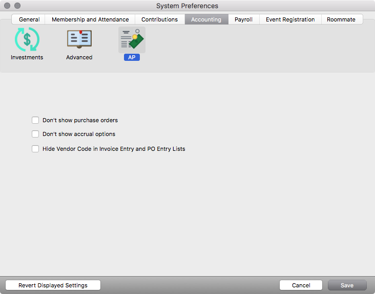 File(Windows)/CDM+ (Mac) > Preferences > CDM+ System > Accounting tab > Accounts Payable icon