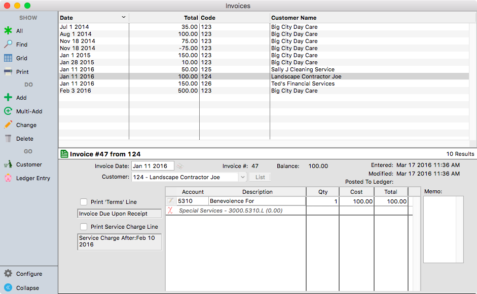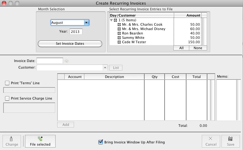 In the Month Selection box, choose the month and year for which you desire to create invoices and reset the invoice dates for that month. Changes to the amount or line items can be made here after clicking the Change button. Any changes here will only affect the invoices being created at this time. Click the File Selected button to create and file these invoices. This creates new invoices for these customers in the Customer Invoices window and updates the Billing tab of the relevant Customer Records.