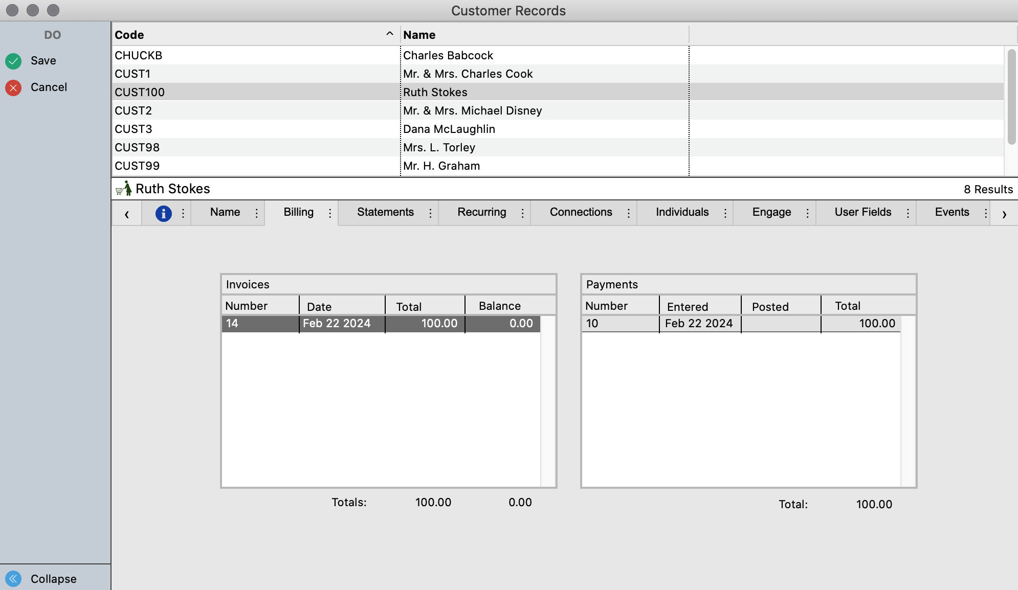 Displays lists of Invoices and Payments for this customer. Total for Invoices, Payments and Balance display.