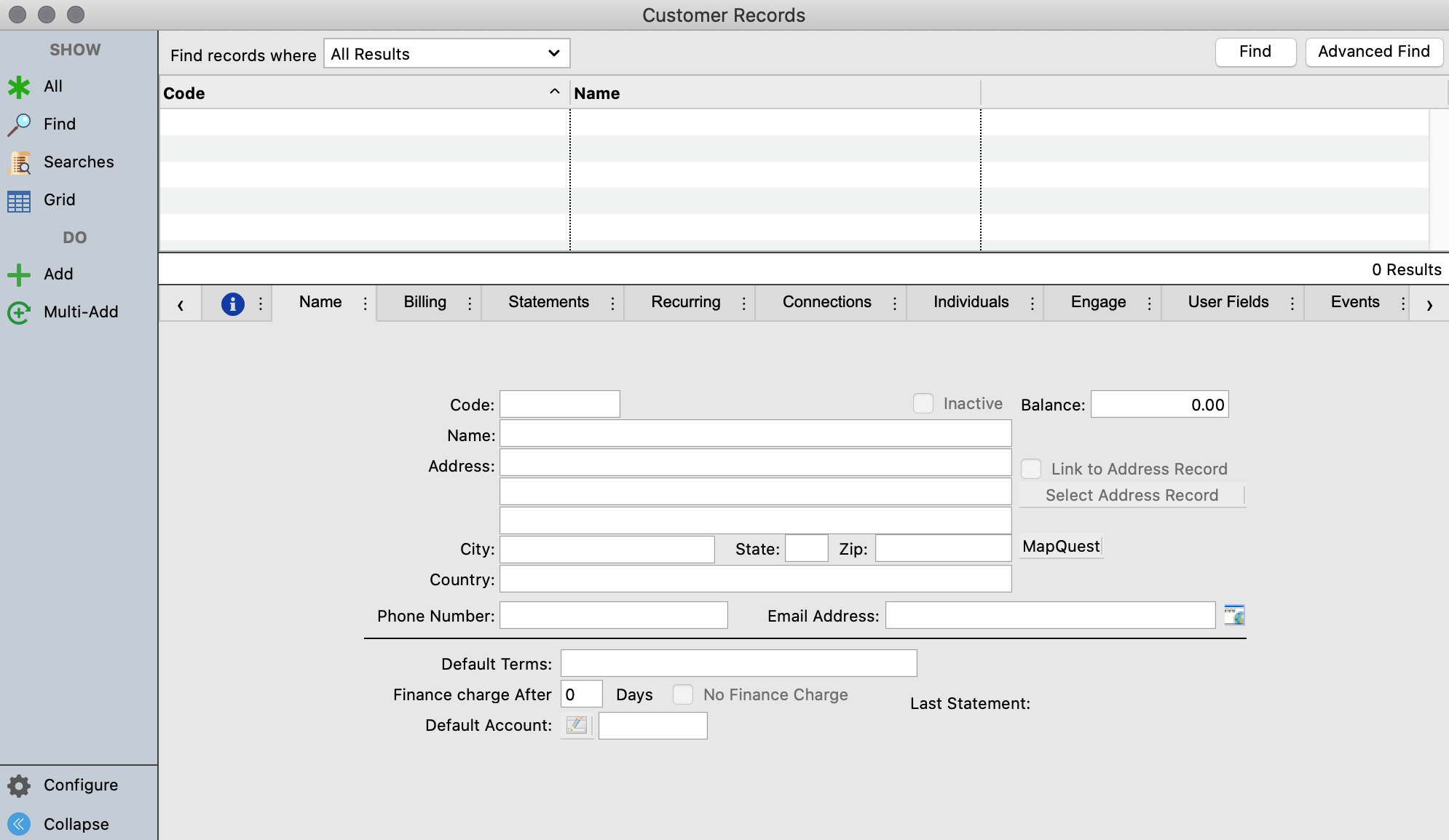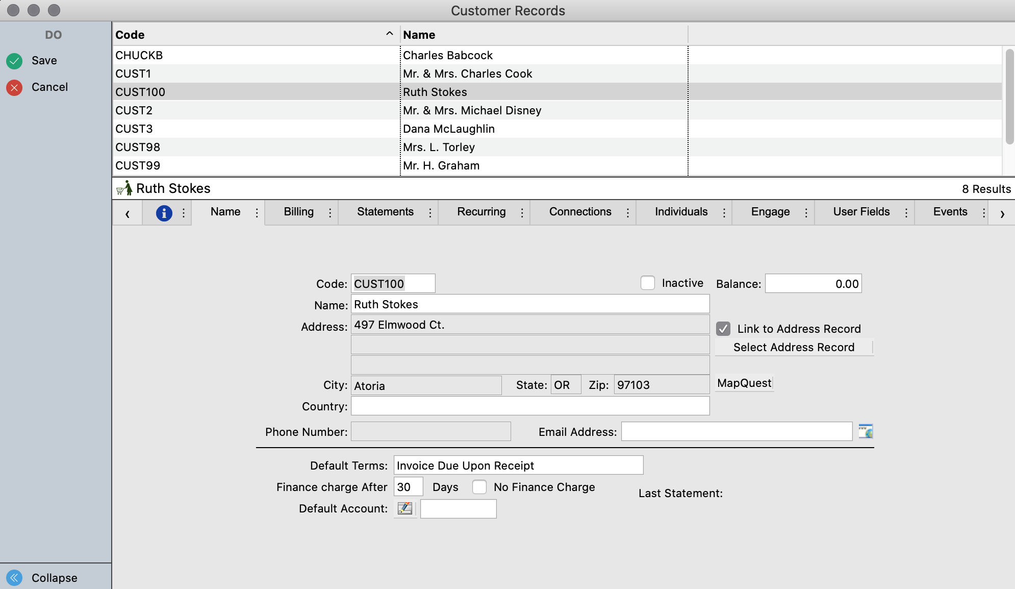 A Default Chart of Account number and Default Terms can be entered if the invoices for this customer are to be charged to the same account most of the time. The last statement date and customer account balance displays on this pane.