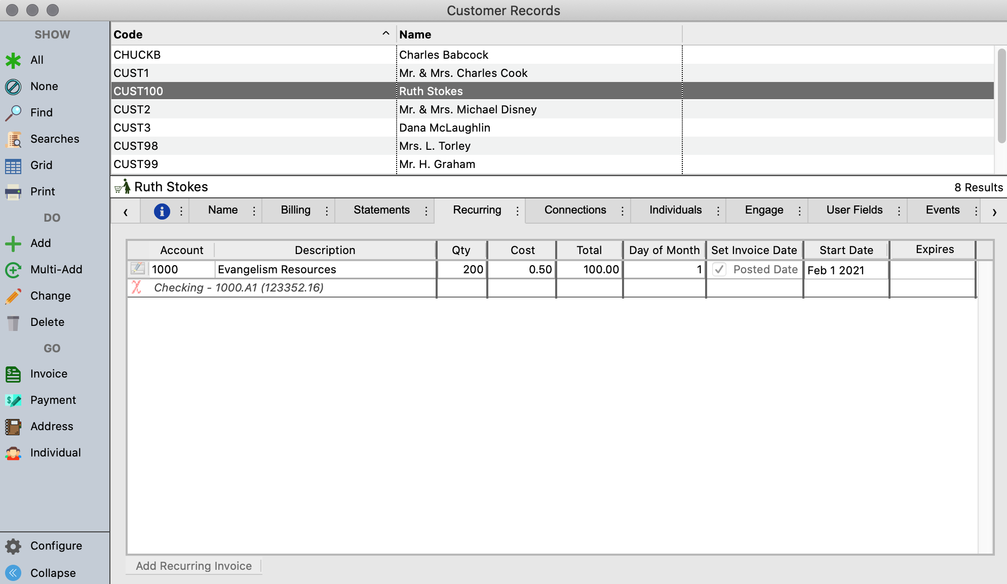 This feature is used for customers who are billed on a regular basis. A Recurring Invoice can be added by clicking Change, then Add Recurring Invoice, and entering the recurring transaction information.
