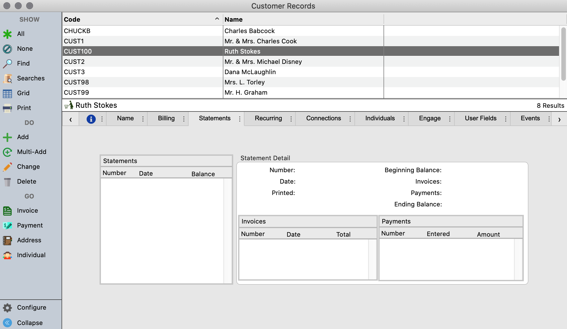 Displays lists of Statements for this customer, including detail of each Invoice and Payment.