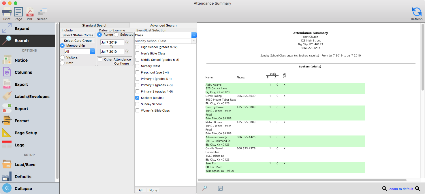 This report gives a summary of attendance for a given Event, Class or Service. This report setup window is very similar to Attendance by Date and Individual.