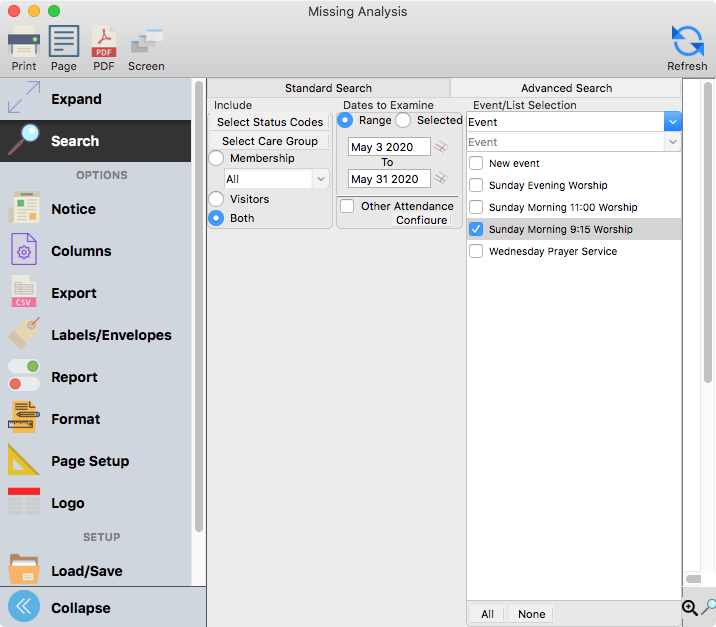 This report is extremely powerful and can provide a great deal of information. The example has a range of 4 Sundays in the month of May. We want to search both the membership and visitors database with all the defined statuses checked. We are looking for all those in the Sunday morning 9:15 Worship Service who were missed any time in the month of May. If we wanted to find those that had missed 2 times in the period, we would set the "Missed At Least" to 2 and the "But Not More Than" to 2.