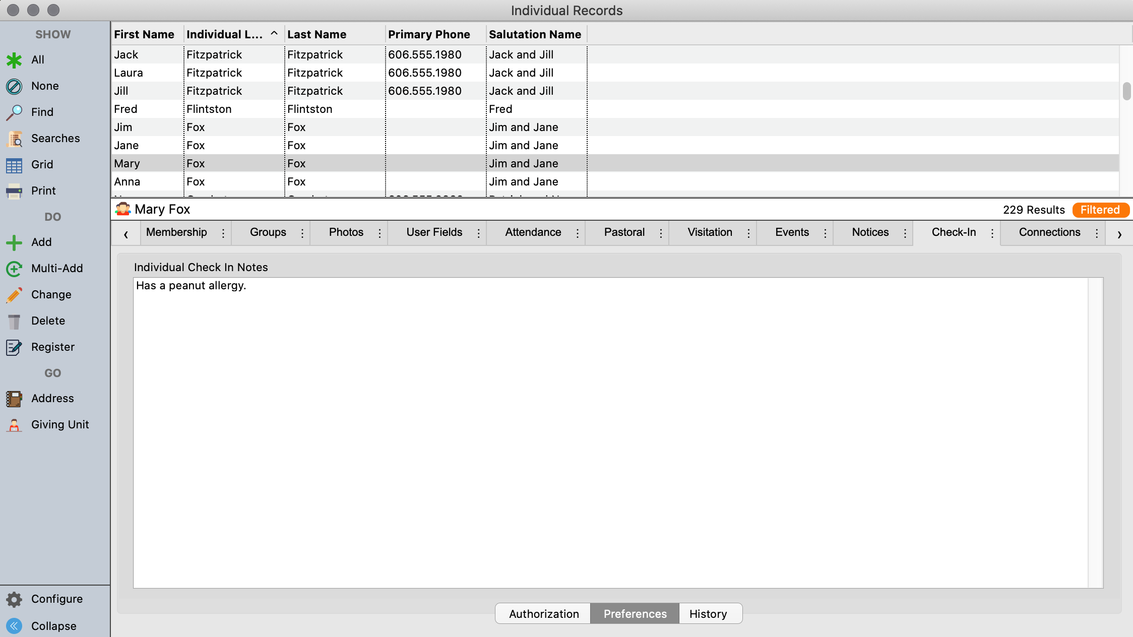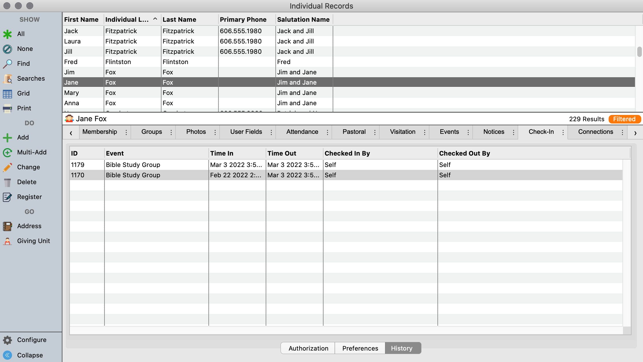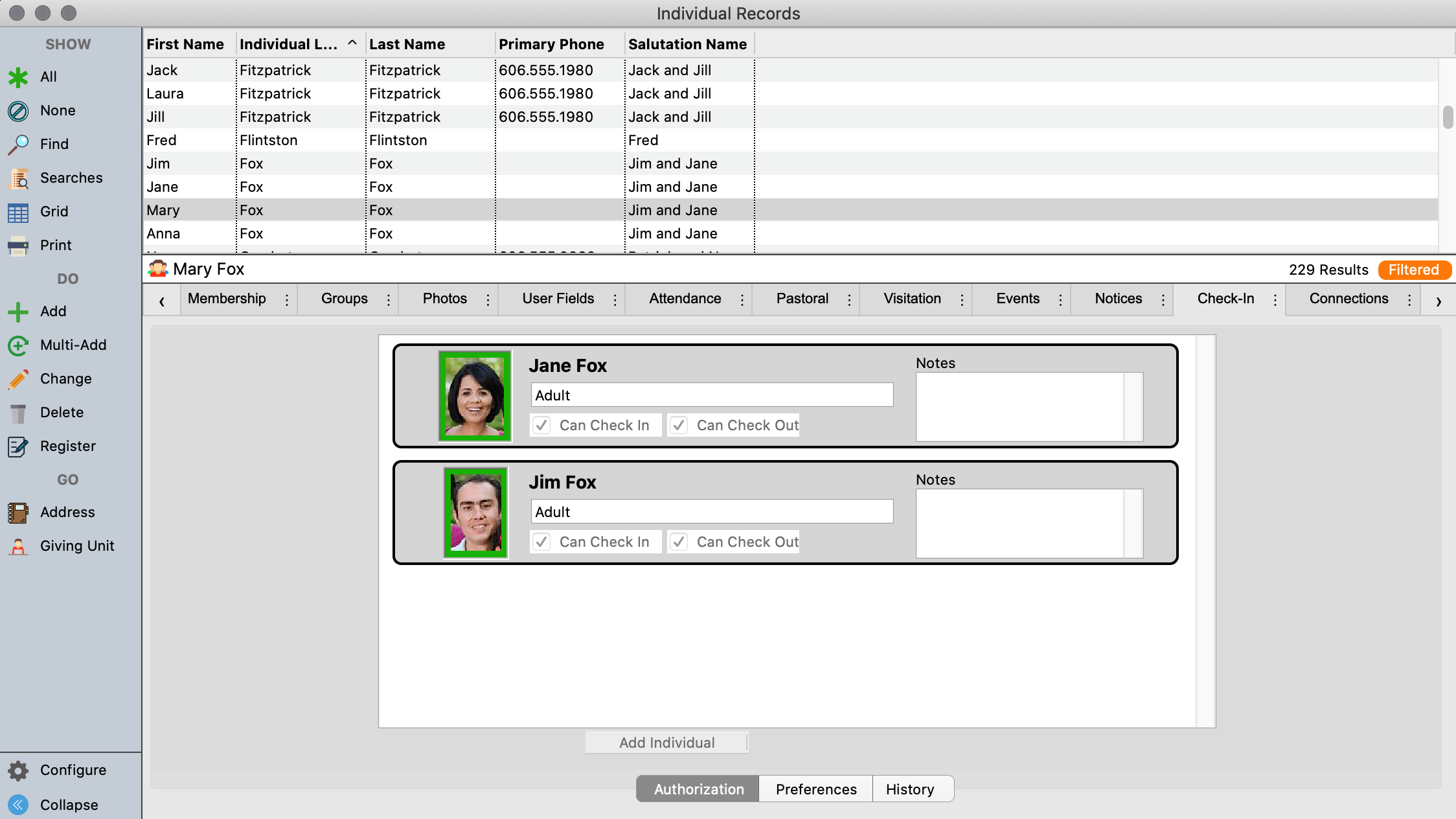 Since CDM+ Membership is so closely tied to Check-In/Check-Out, a Check-In tab has been added to the Individual Records window. Within this tab are three sub-tabs—Authorization, Preferences and History.