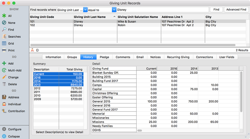 The contribution history for a giving unit is available on the History tab of the Giving Unit record. The Summary section lists all available contribution histories for that giving unit. Selecting a history from the Summary list will display the breakdown by giving fund for that giving unit in the Detail area. You can select multiple histories from the Summary to view a comparison of those histories in the Detail area.