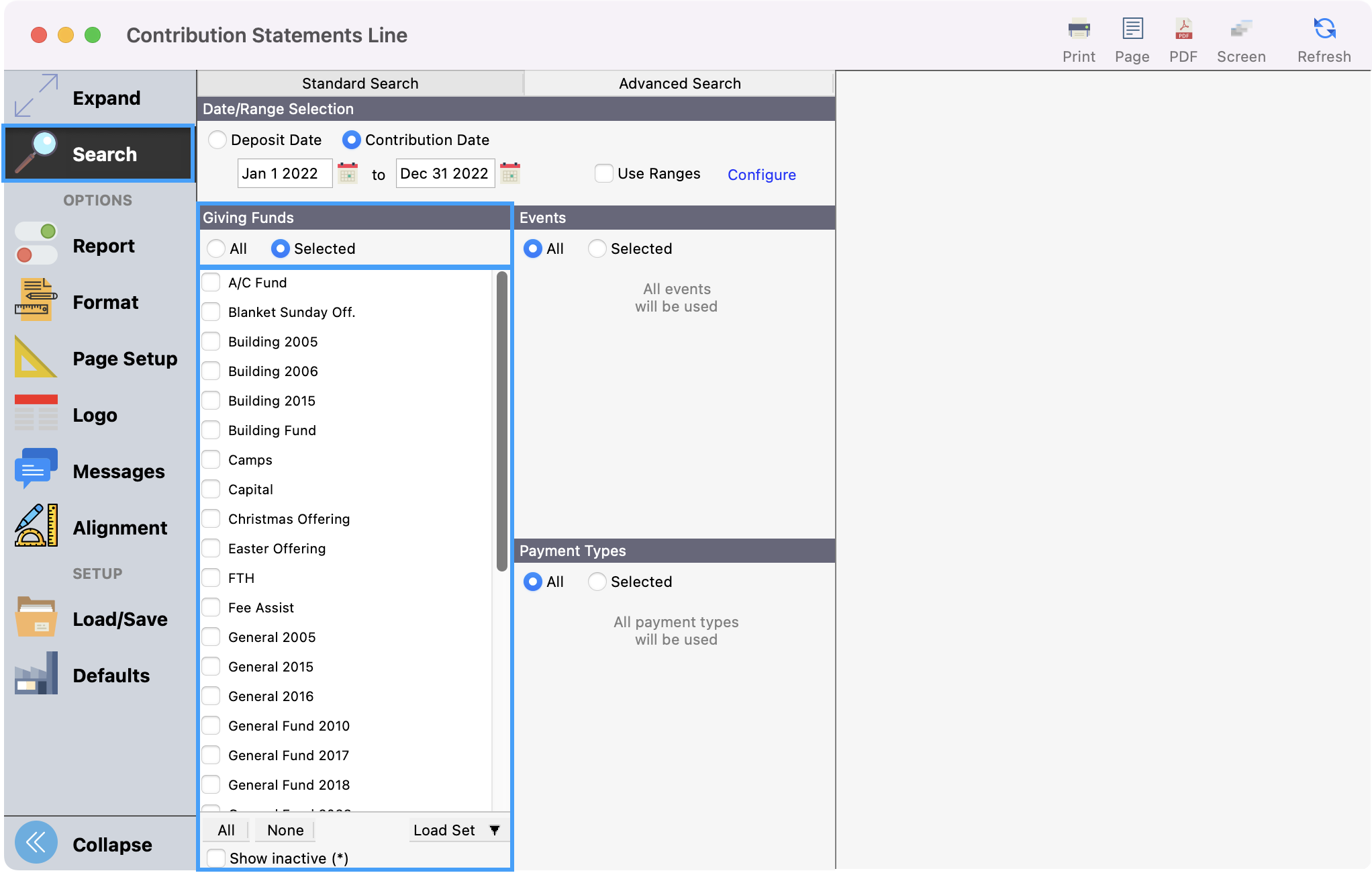 Under the Giving Funds section, either select the giving funds you wish to use by clicking Selected or choose all using the All radio button. Keep in mind that when choosing All, this will include any inactive funds as well.