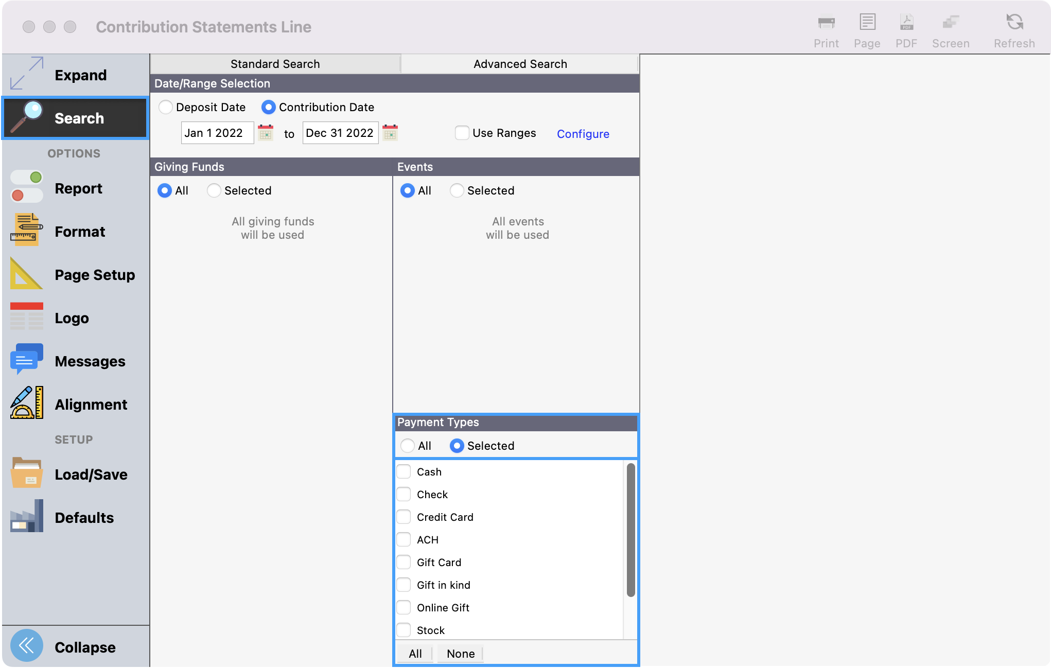 Contribution Statements Line, of giving statements is set up just like Contribution Statements, except that on the Report menu you do not choose columns to include on the report.