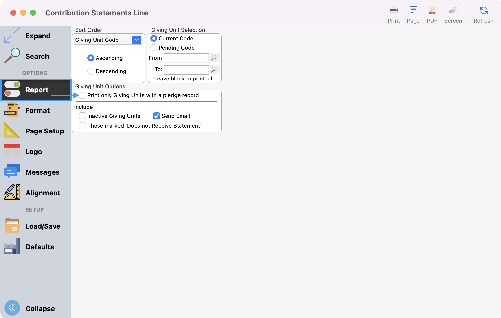 Under Giving Unit Options, you can choose to Print only giving units with a pledge or keep this box unchecked to generate all statements.