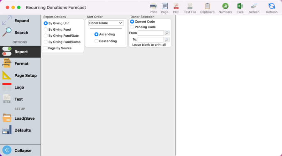 - Under Report options, set the way you wish to see the report printed. We want to see the forecast by Donor (Giving Unit). You can also set the sort order of the report here too.