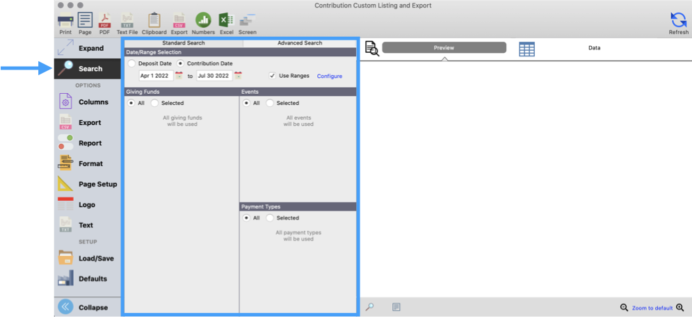 On the Search tab, narrow the criteria to be shown on the report by Date/Range, Giving Funds, Events, and Payment Types.