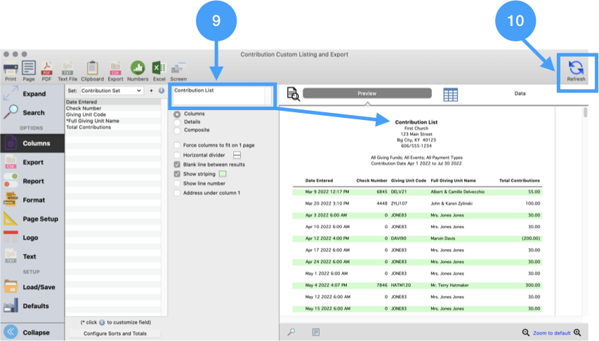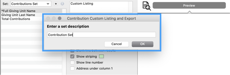 Near the top of the report window, there is a text box where you can change the name for the report. The default name is 'Custom Listing.' You can enter any name for this report for example we changed it to Contribution List.