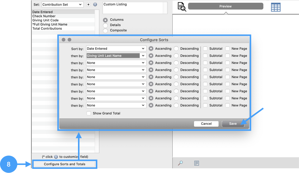 At the bottom of the report window, click Configure Sorts and Totals. This window allows you to select as many different sorts as you like. The report can also be set to subtotal by a specific sort and have the sort start a new page. So, select how you want the results to be sorted on the report using the dropdown menu and other buttons. Click Save when finished.
