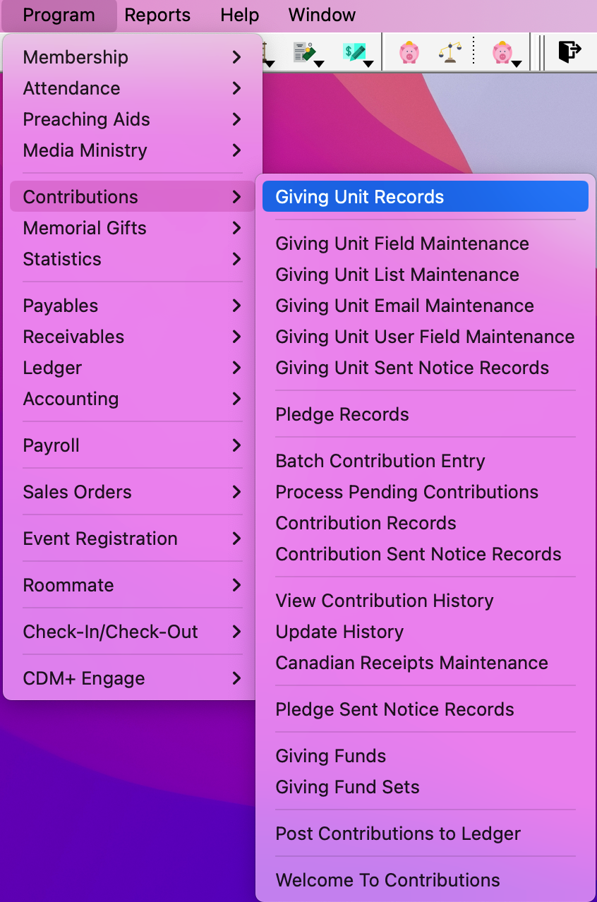 To navigate to Giving Unit Records go to Program → Contributions → Giving Unit Records.