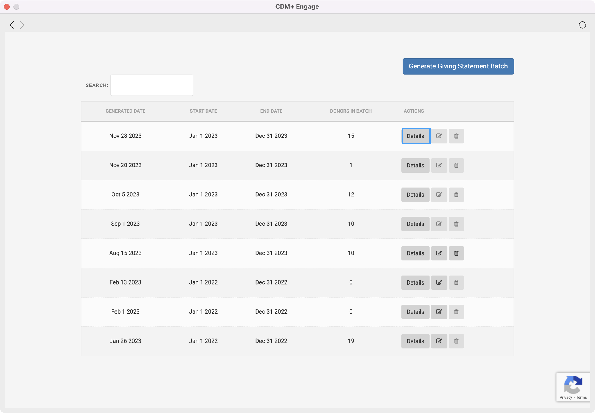 Here you can use the dynamic search field that allows you to search by a donor's name, amount of donation, donor code, etc so you can view a statement you are looking for.