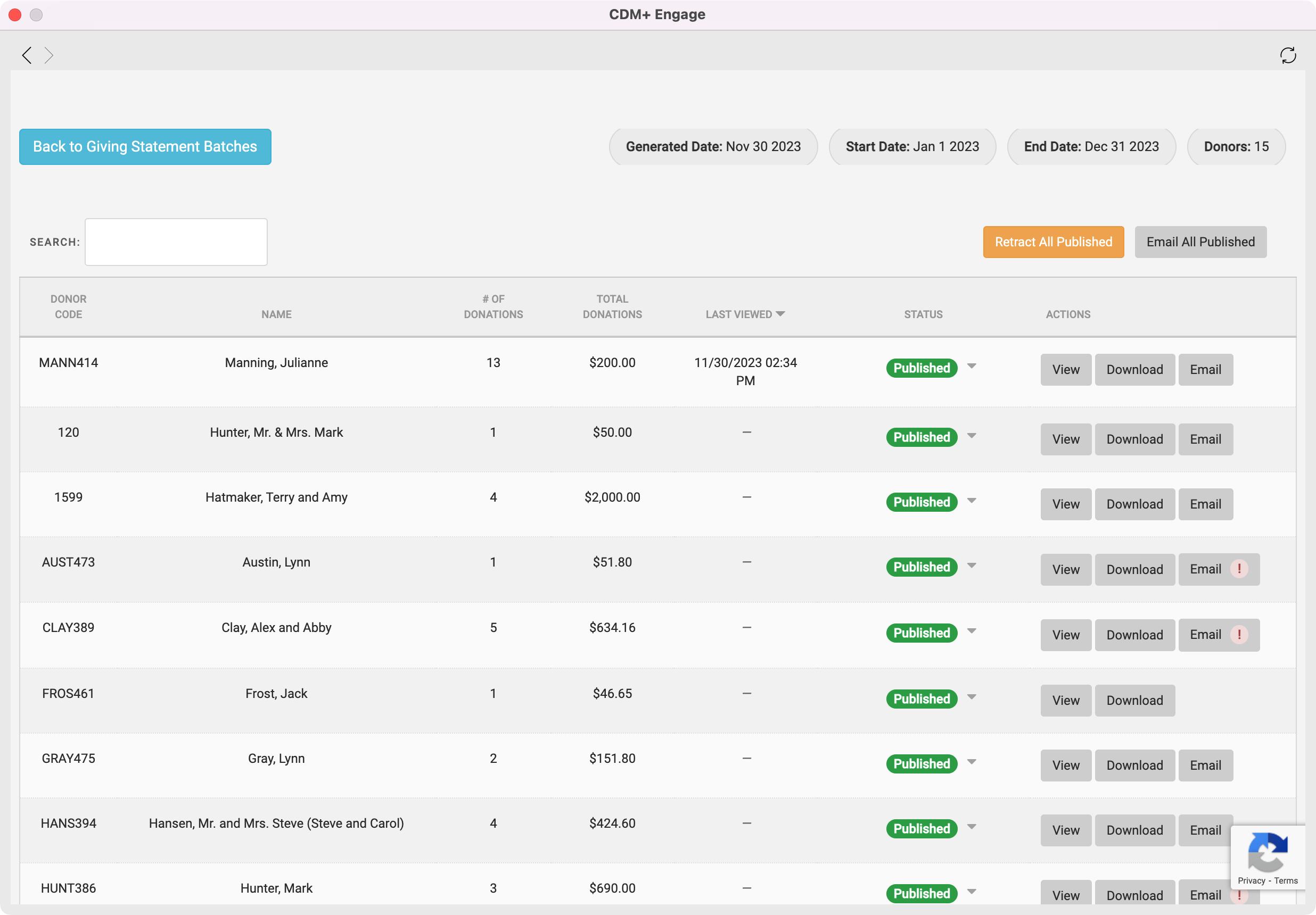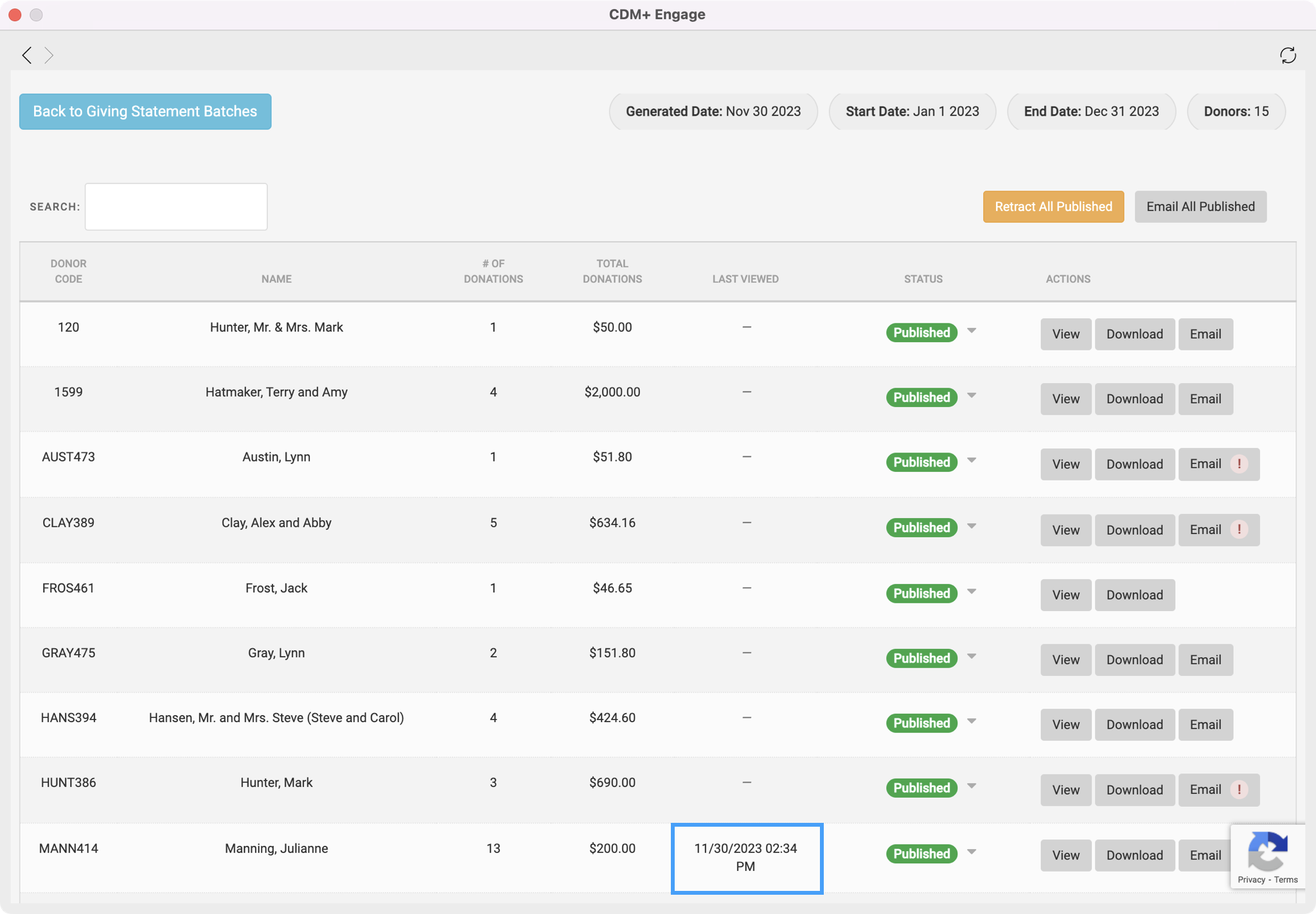 When a donor has viewed their statement, you will see a date and time stamp in the Last Viewed column.