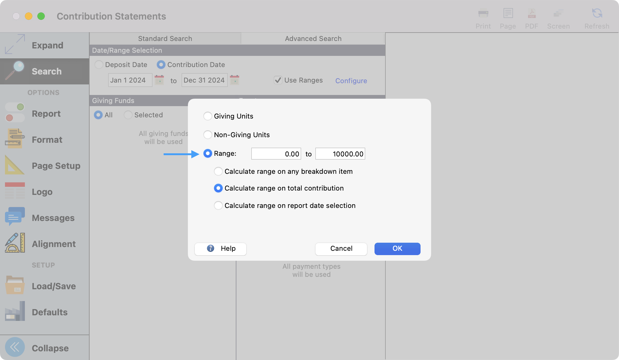 For example, Robert Jones gives $400 total and you enter one entry splitting the gift as $200 to General and $200 to Building. Robert Jones also has previously given $50 on 1/1 and $100 on 3/31. If you configure your range selection to include $250 - $999,999.99, option 1 would not include this gift nor any other gift – he would not have a statement produced. Option 2 would include this gift, but would not include the other two gifts. Option 3 would include this gift, and would include the other two gifts since the grand total ($550) was within the range.Use Ranges/Configure – Once you've enter the low and high ends of your Range, you are presented three options.
