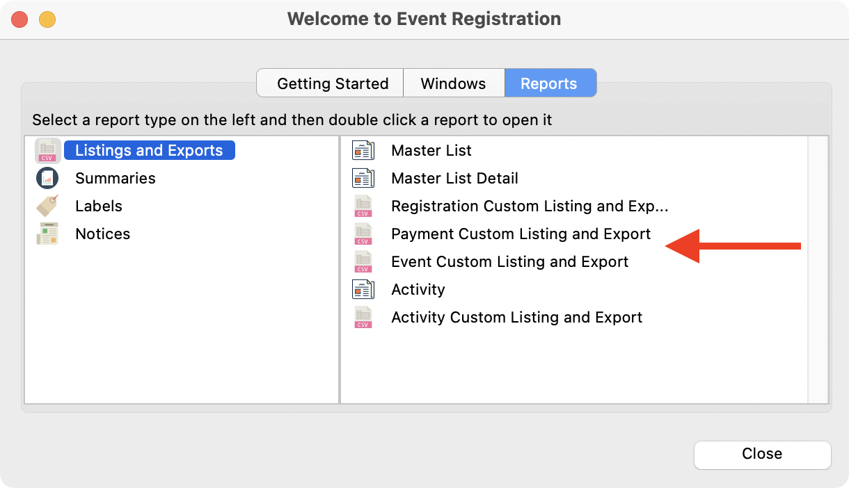 Use the Event Custom Listing and Export and Payment Custom Listing and Export to build custom reports for your events and payments.