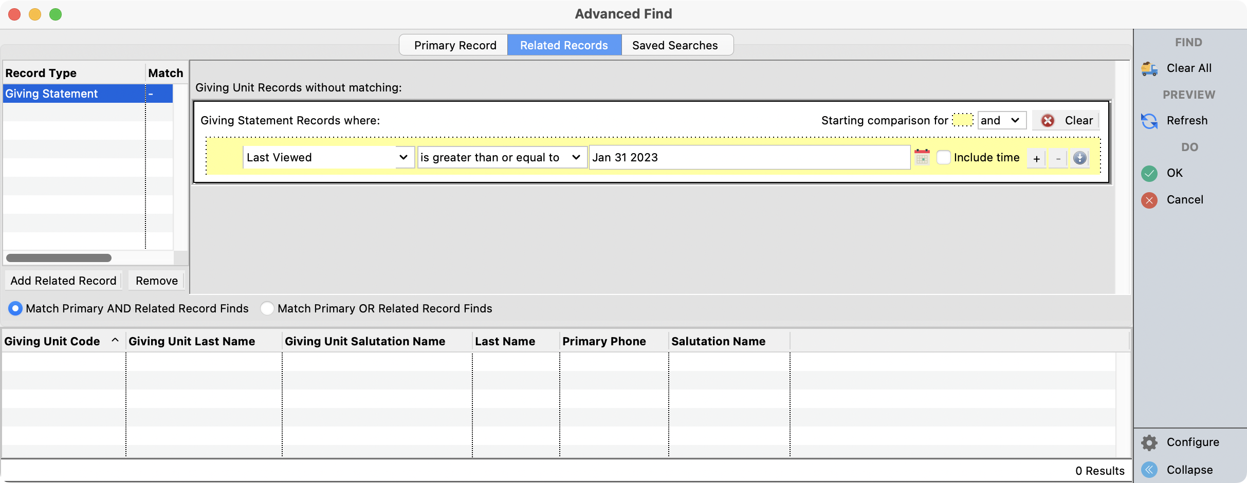 For example, use the following search to find givers who haven't viewed an online statement since January 31st.