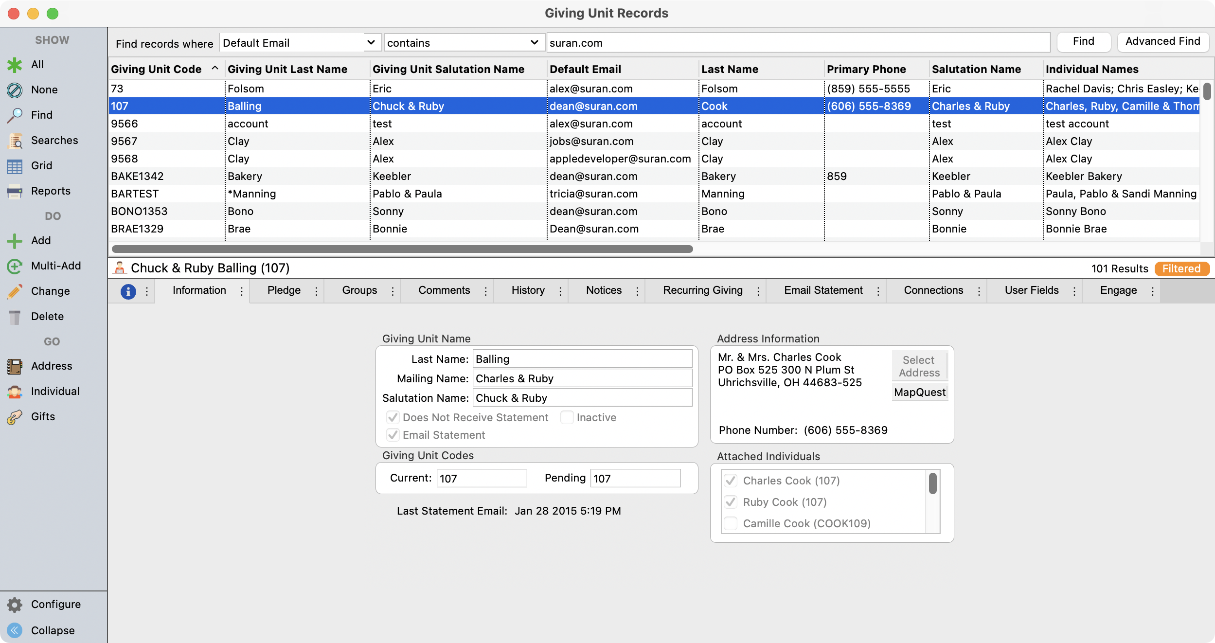 The Email tab on Giving Unit Records has been renamed to Email Statement for clarity.