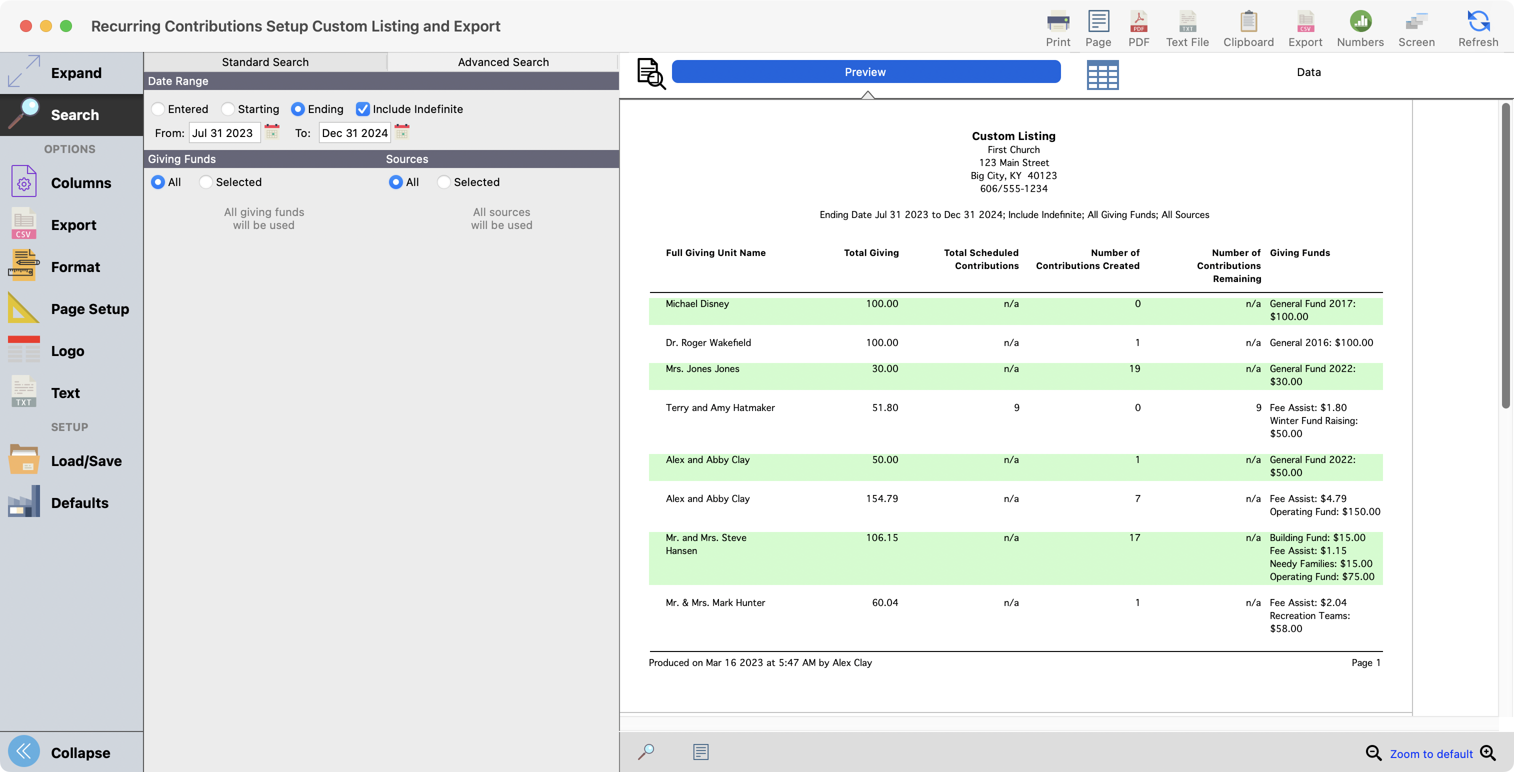 We've added a Recurring Contributions Setup Custom Listing and Export report to create reports for recurring gifts, both manual and online. This report also gained date range options on the standard search.