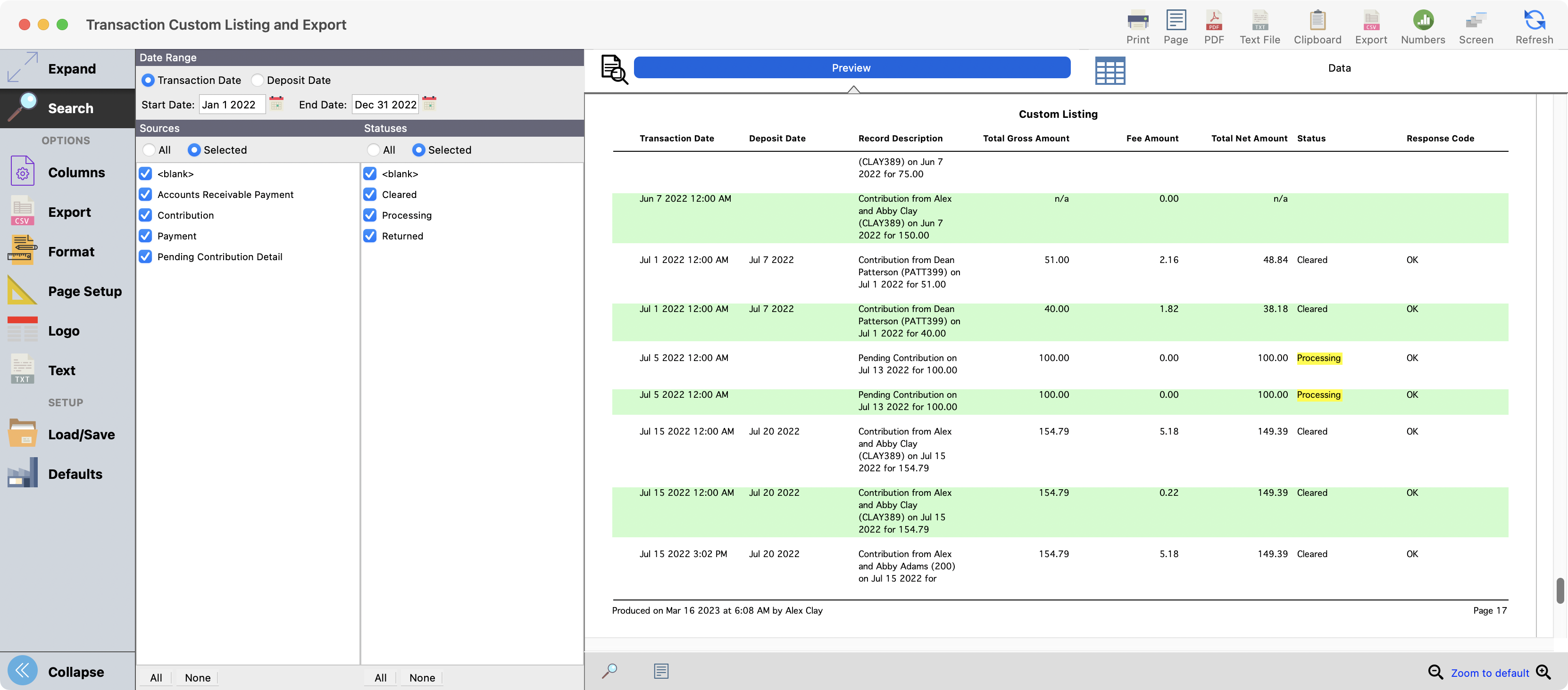 Transaction Custom Listing and Export
