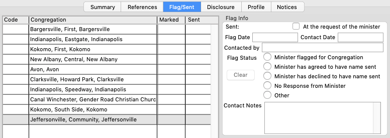 Each minister/church combination has its own set of flag/sent data. Make sure the intended congregation is selected in the table before flagging the profile or entering comments!