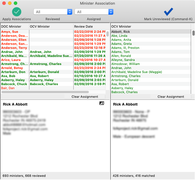 - If you are sure these are the records to be associated, double-click the minister's name on the OCV side of the window. The names on both side should turn green.