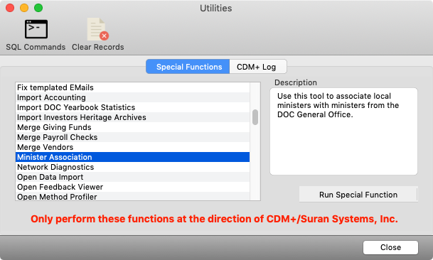 To launch the Minister Association utility, log into CDM+ and navigate to File > Utilities. Scroll down in the alphabetical list to Minister Association, select it, and click Run Special Function.