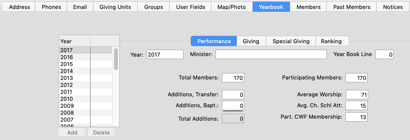 Once imported, Year Book data is available for review on the Yearbook tab of the Church Record.