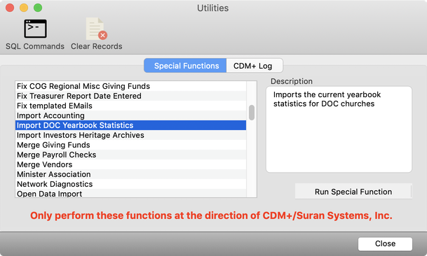 To import Year Book data, choose Utilities from the File menu. Scroll the list to find Import DOC Yearbook Statistics. Select it, and click the Run Special Function button. CDM+ will import Year Book data into your database.