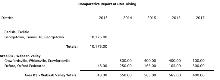DMF Congregational History allows you to choose five years and presents DMF giving by congregations over the selected five years. Select the five years to be included from the Report tab. Congregations are grouped by section, district, or area with subtotals.
