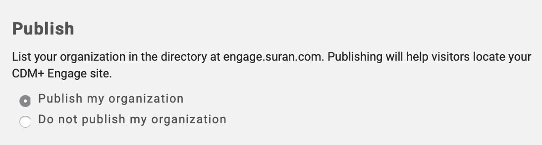 By default your organization will appear in the Organization Directory, and can be searched for by name. If you do not want your organization published, check Do not publish my organization.
