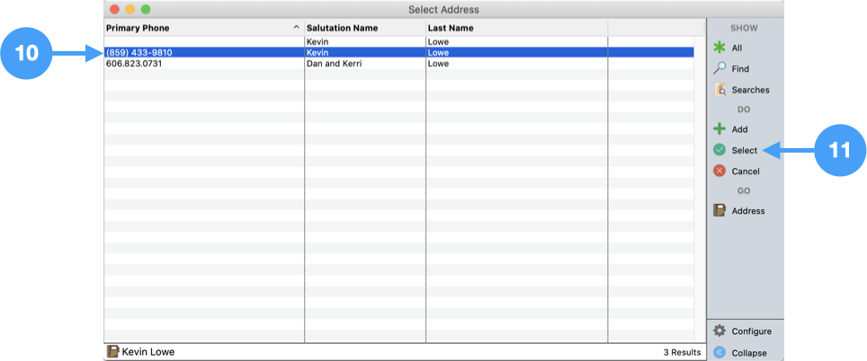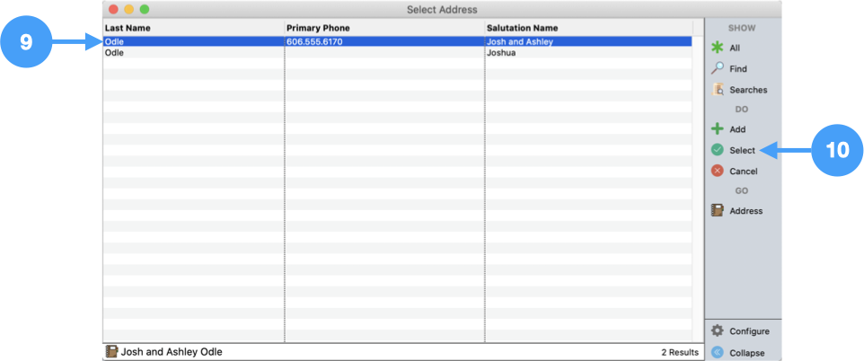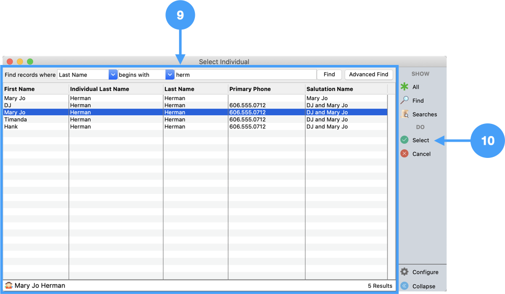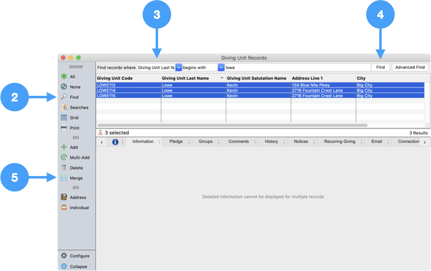 Configure a find to locate both giving units, such as Last Name equal to
