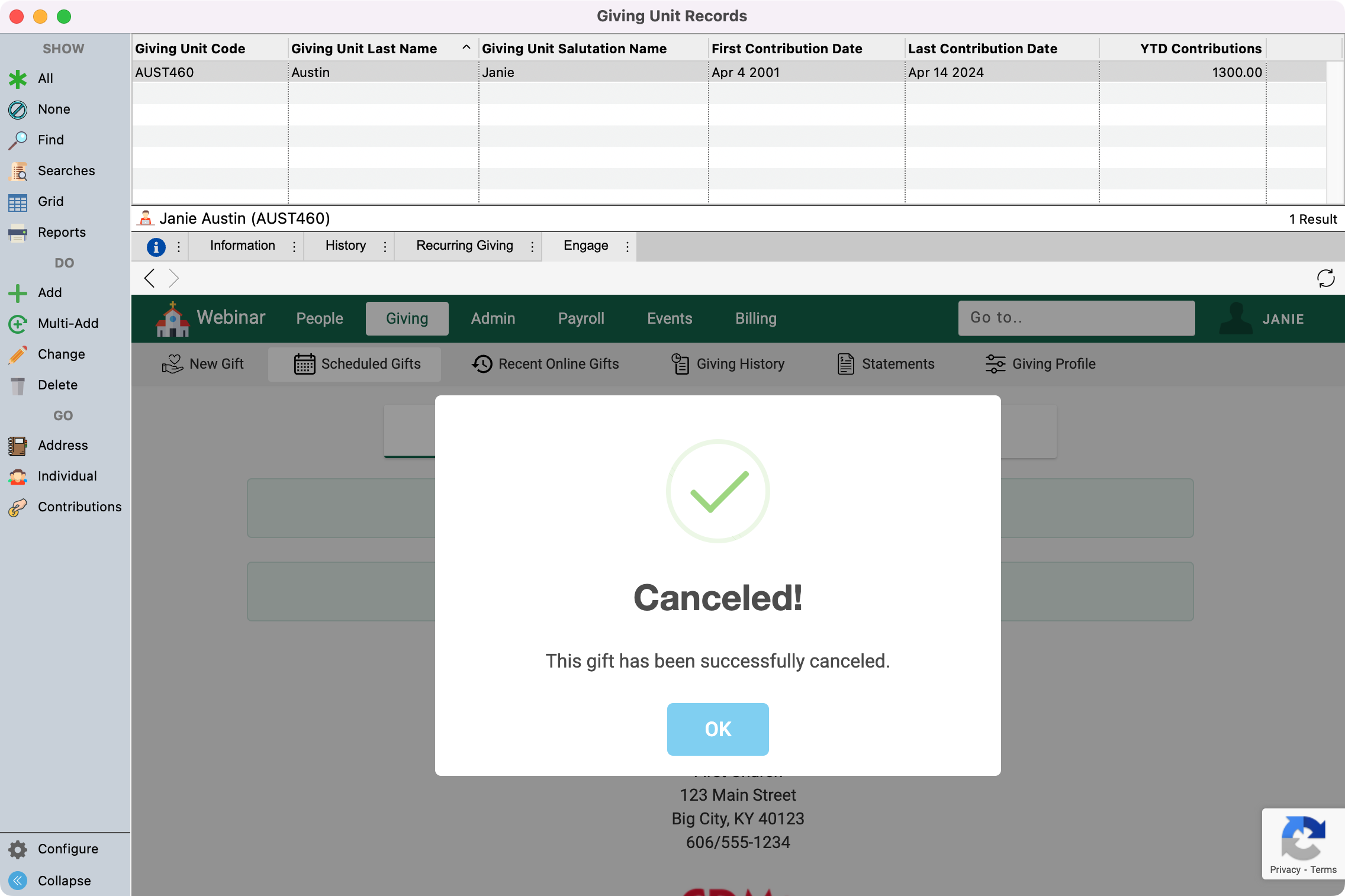 You will then see a message letting you know the gift was successfully canceled. Click Ok.