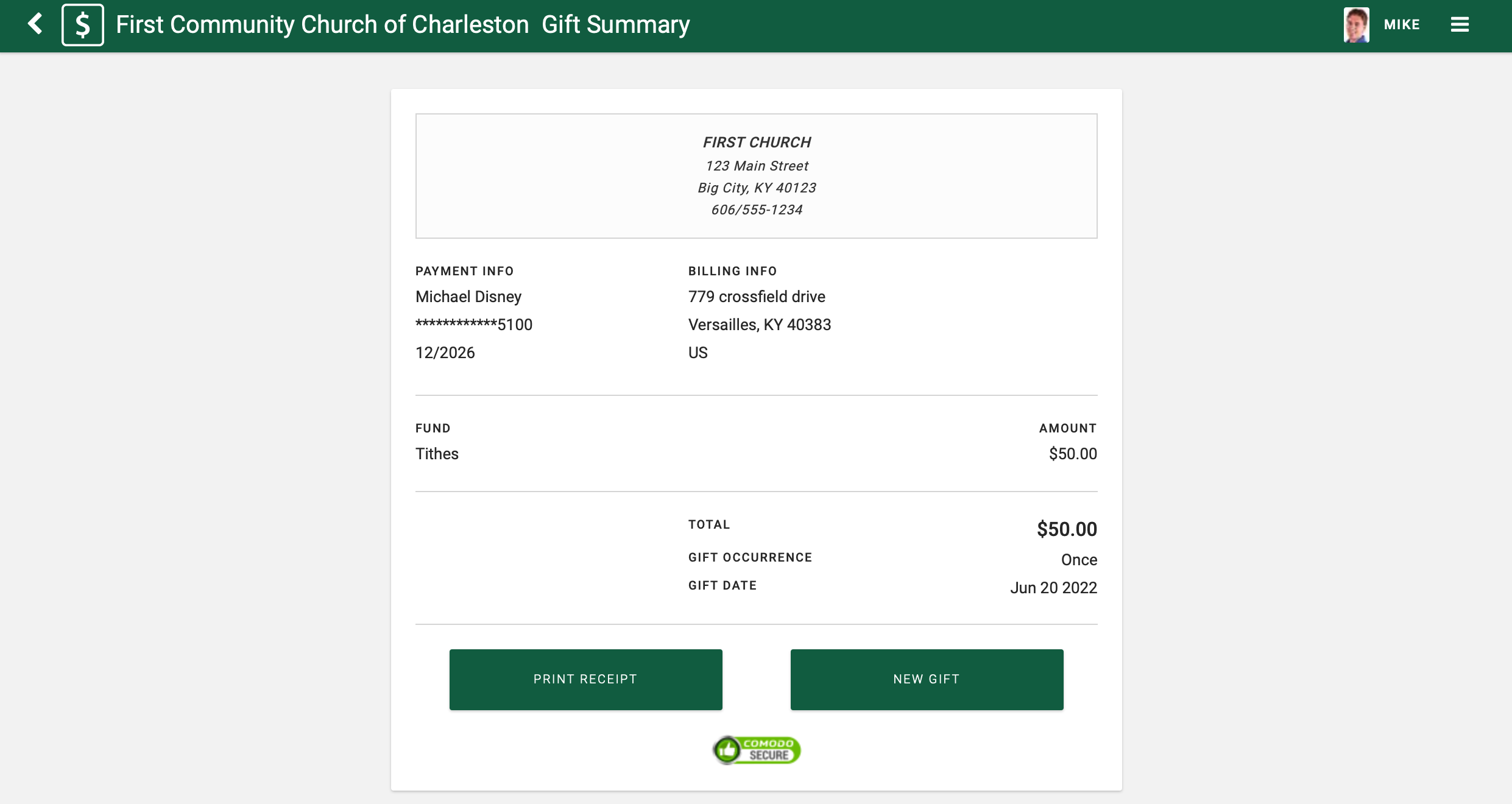 - The Gift Summary window will display, providing the details of the gift and offering a Print Receipt option.