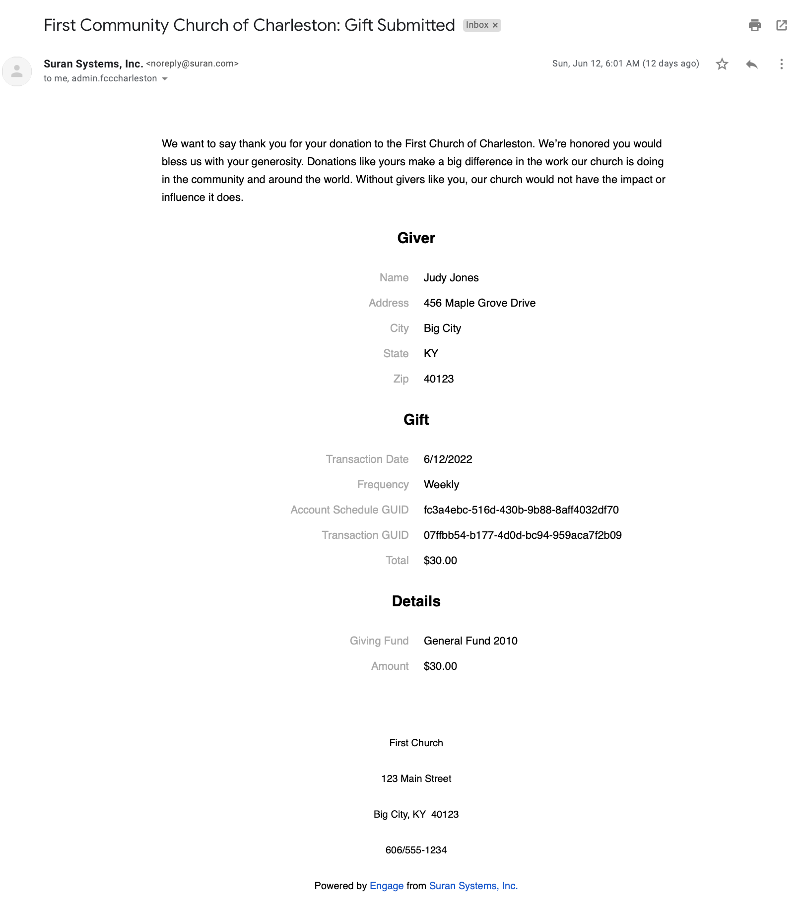 The second email is sent to a staff email address advising that an online gift has been received or a recurring gift has been established.