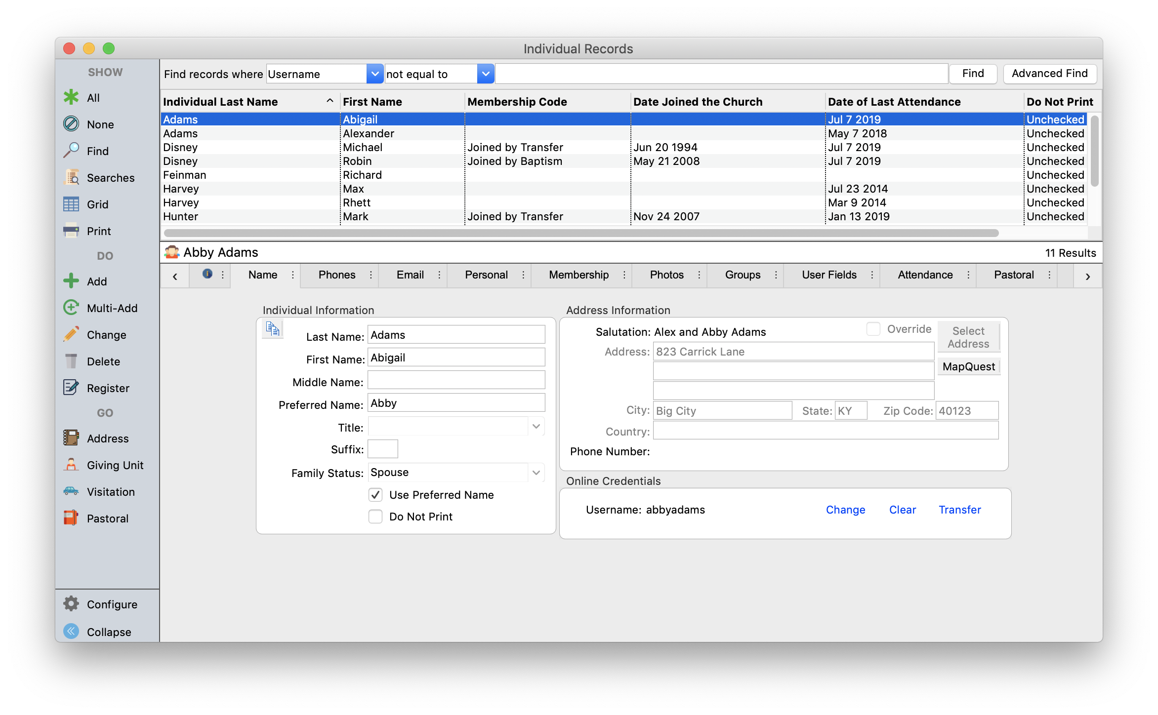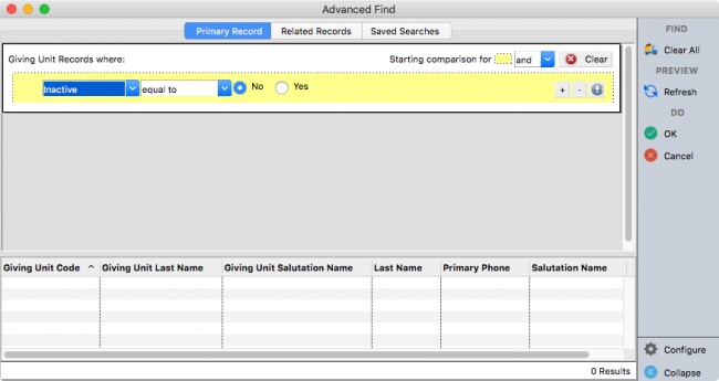 On the Primary Record tab of the Advanced Find window, you might limit the search to active giving units by specifying Inactive = No.