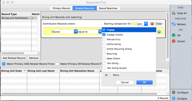 The results of this search will return all giving units that have ever made a contribution using Engage.