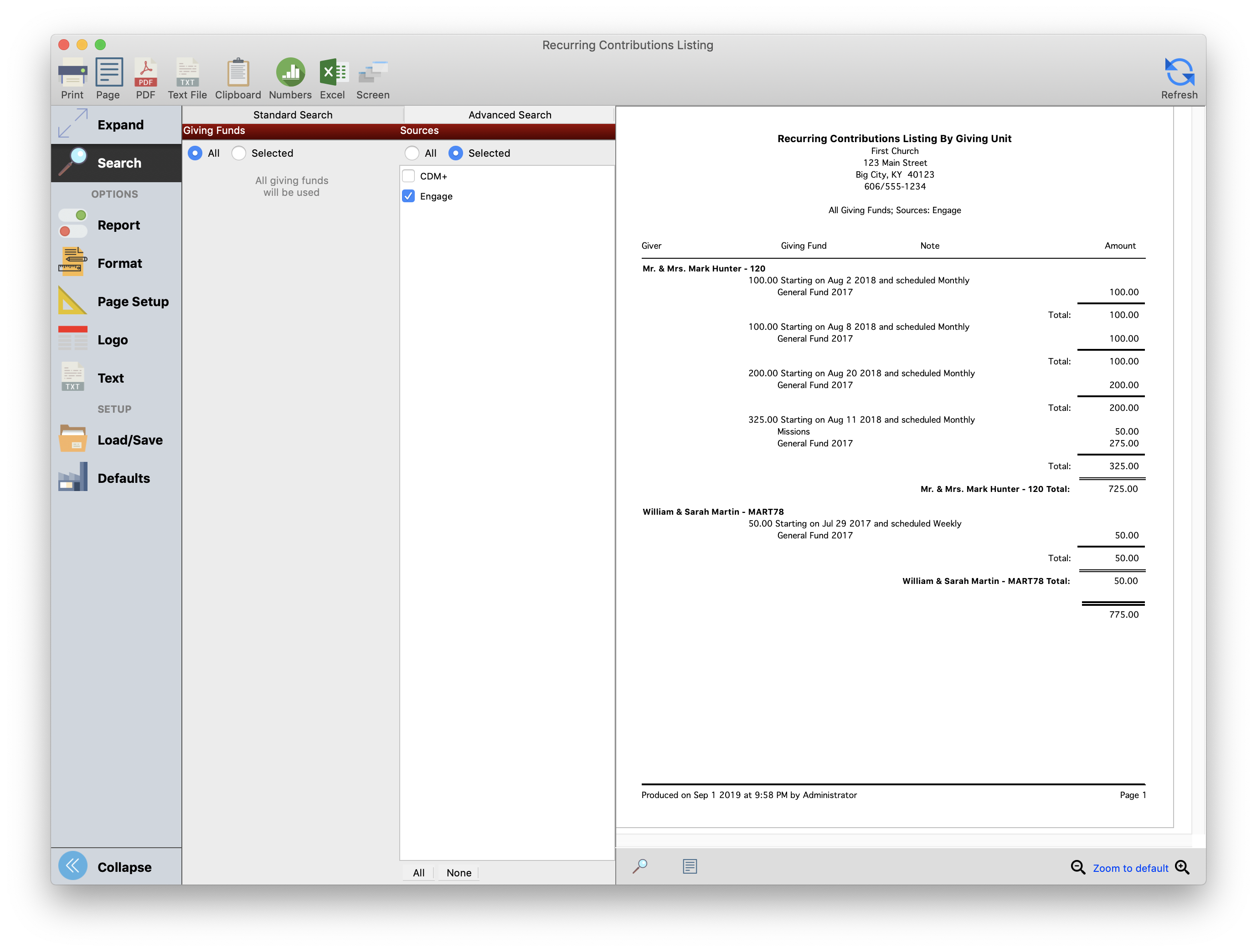 The Recurring Contributions Listing report (Reports → Contributions Reports → Recurring Giving → Recurring Contributions Listing) lists the setup for recurring gift. Use the Sources option to limit this report to Engage gifts to see active recurring giving.