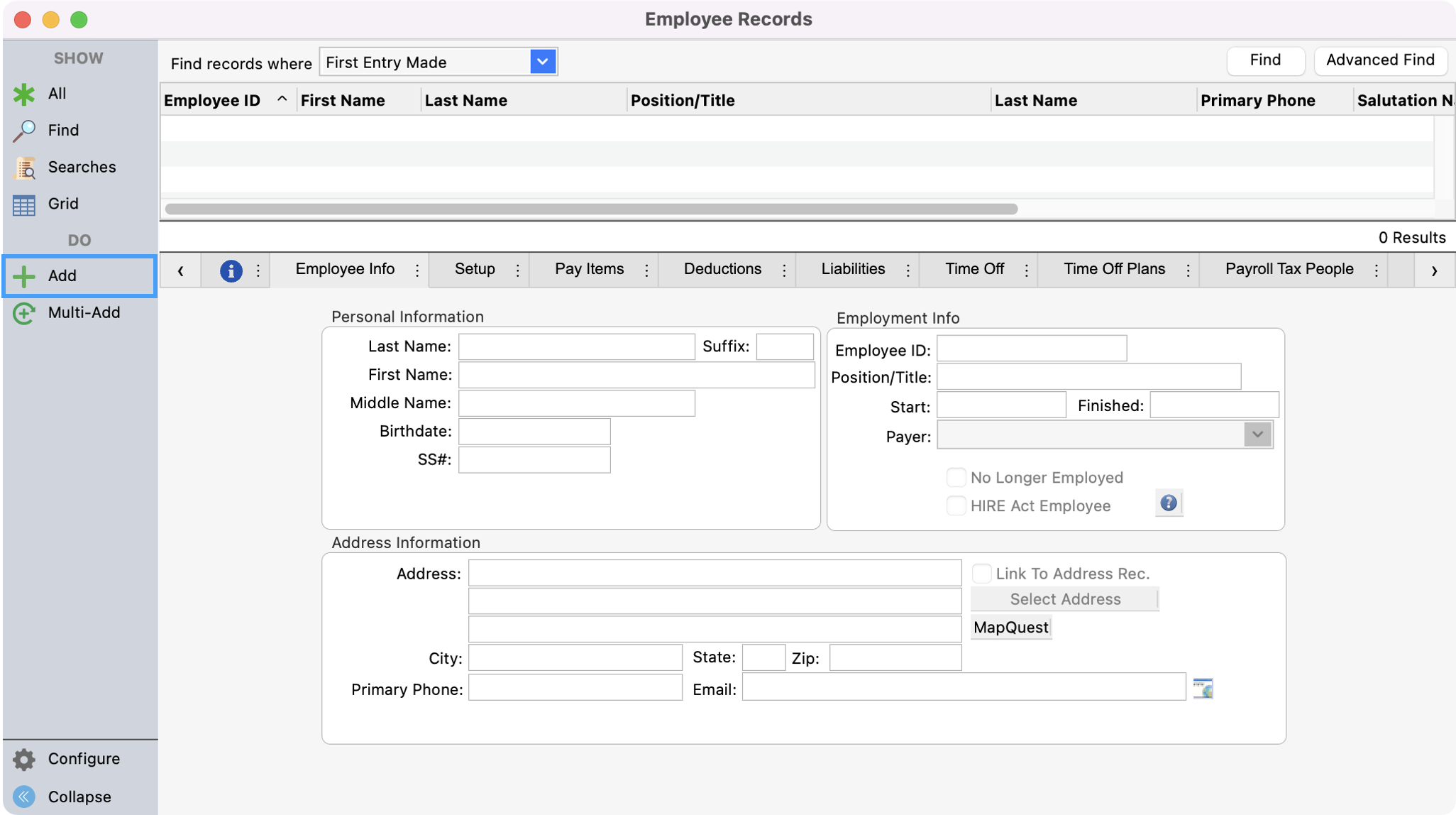 The next step is to create the Employee record and tie the Address and Individual record to the Employee record. Go to Program → Payroll → Employee Records.