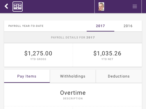 Clicking or tapping the four-digit year will bring up year-to-date summaries for the current or previous year. Clicking or tapping the tabs for Pay Items, Withholdings, and Deductions reveals additional year-to-date amounts for the year selected.