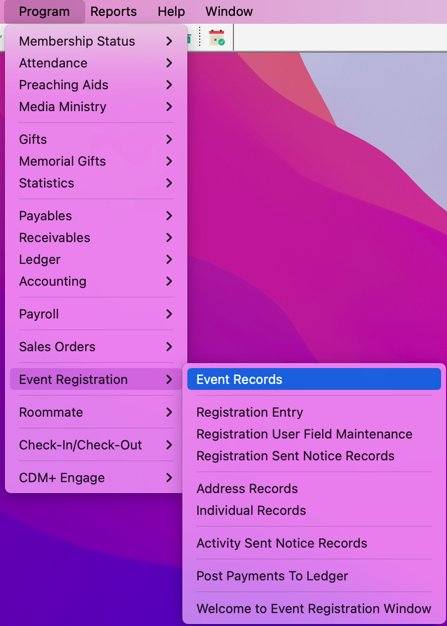 If you have chosen under Preferences-Toolbars to show the Event Registration toolbar, you may click the Event Registration icon.