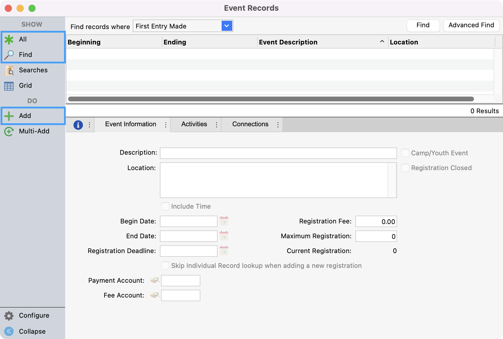Next, you will see the Event Records window will open. You can click All from the left sidebar or set up a find to search for an existing Event. Click Add from the left sidebar to create a new event.